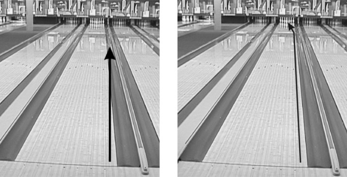 Two common mistakes people make (because they believe their eyes) are lofting the ball farther out onto the lane than usual and throwing the ball harder than usual. Because it looks like the ball will land right into the gutter, beginner gutter rats will tend to hold on to the ball and loft it out thinking that will help the ball land on the lane, instead of going into the gutter. It’s just an illusion. The gutters don’t really point in the way they look.