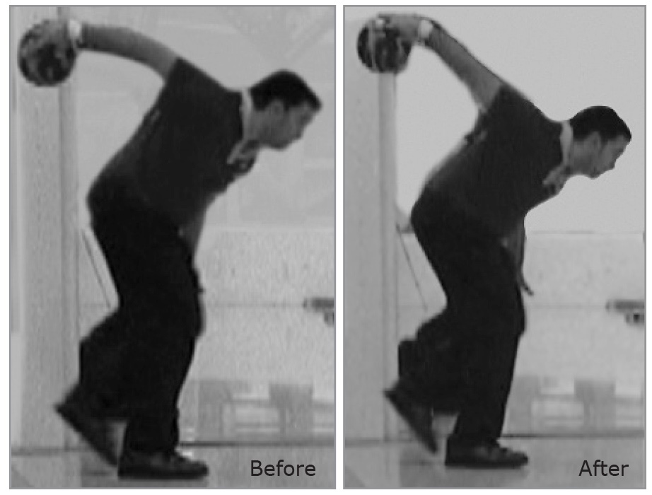 His follow through was under his head, yet the elbow didn’t remain inside or parallel with the wrist. The worst impact was frequently falling off at the foul line, especially in competition when the pressure was on him to make a shot. Before the intervention, his ball movement into the swing was 100 percent incorrect and he fell off shots over 50 percent of the time in competition.