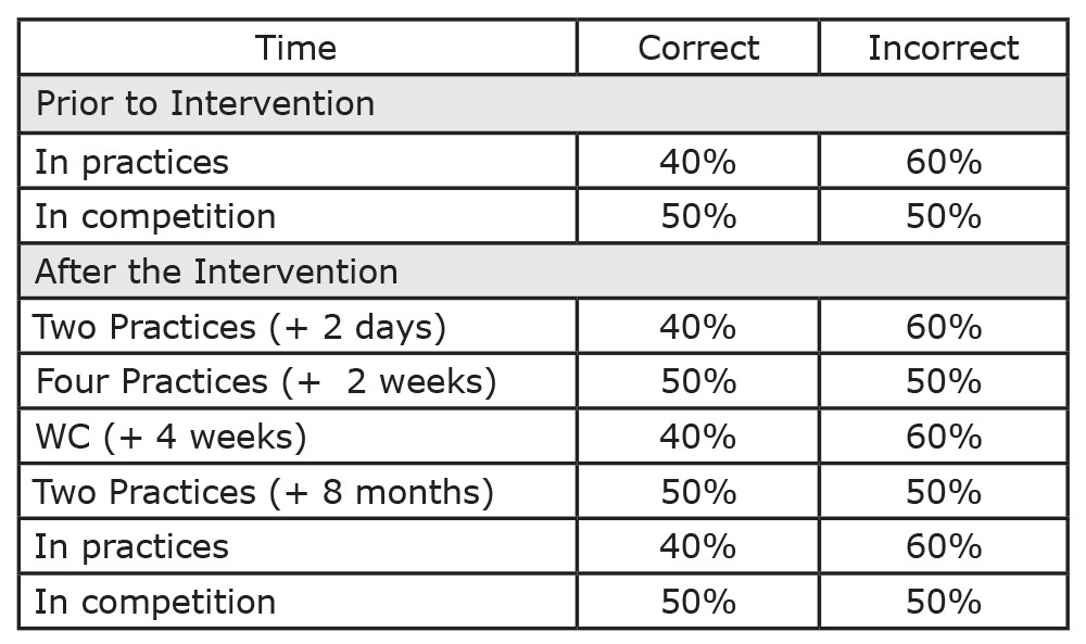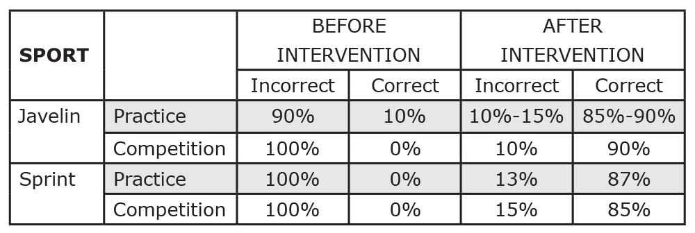 Here are the findings of implementing the Old Way / New Way model with Olympic athletes. Table 1 provides data of the percentage of correct physical execution before and after implementation for competitors in javelin and sprint events.