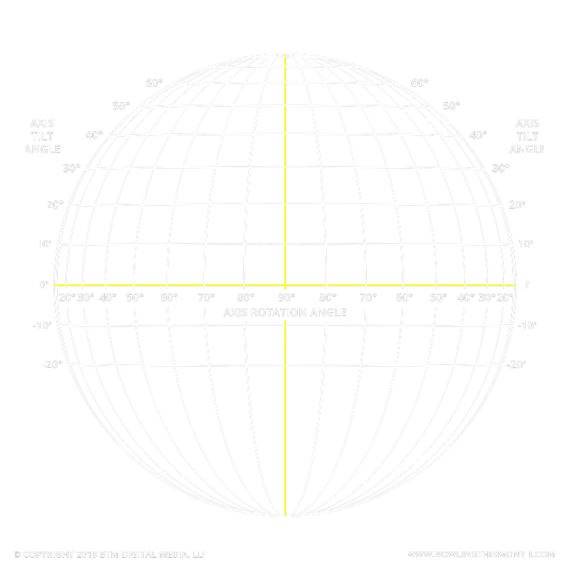 When we view a bowling ball from behind, its axis rotation angle is basically a function of how much its rotation axis “points” back toward us. In the above image, for example, the ball on the left has 80 degrees of axis rotation; note how its rotation axis is pointed back toward us. The middle ball has much less axis rotation—45 degrees—and you can see that its rotation axis is pointed less toward us than the 90 degree example, and more toward the left side of the ball. And, the ball on the right, whose rotation axis is pointed even more toward the left side of the ball, has just 30 degrees of axis rotation.