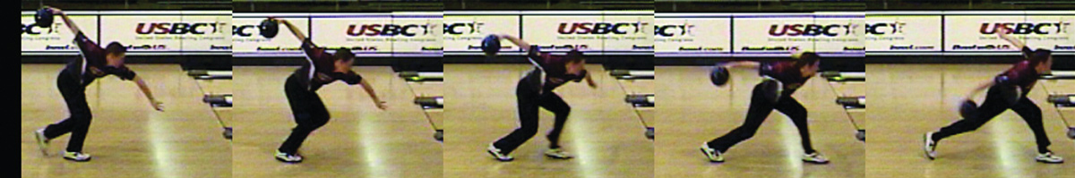 Into the release, the fingers should be on the inside of the ball. In the downswing, envision the index finger being directly forward toward the pins. This will place the ring and middle finger in approximately the 7 o’clock and 8 o’clock position (for righthanders) or 5 o’clock and 4 o’clock (for lefthanders). The release sequence illustrates the index finger placement and arc line traveled with the fingers.