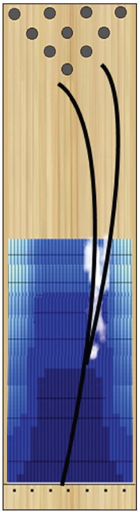 As bowlers continue to play in the same general zone, oil is depleted and friction creeps closer toward the foul line and into the midlane zone. This midlane friction evolves into bad friction or what I refer to as El Diablo. El Diablo is an unfriendly zone because it causes a bowler to lose carry due to reduced ball motion and the loss of hold. The ball motion in El Diablo territory is what I call the “Y”.