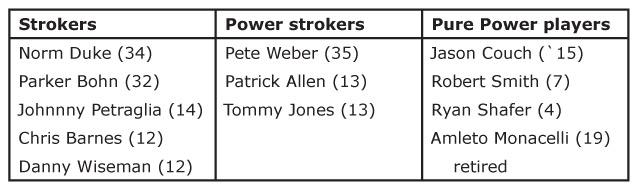Strokers, power strokers, and pure power players on the PBA tour for at least five years with at least four titles