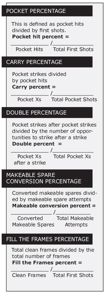 The key to allowing an effective analysis requires structuring data collection. I will begin by defining which data we want to be able to analyze. To begin, the major elements of scoring include hitting the pocket frequently, carrying when one hits the pocket, repeating shots when one is lined up, filling frames, and converting makeable spares. In order to calculate these for analysis, we will collect the following data: first shots, pocket hits, pocket strikes, makeable spares, converted makeable spares, and strikes after strikes (doubles). These data points will be used to calculate the following: