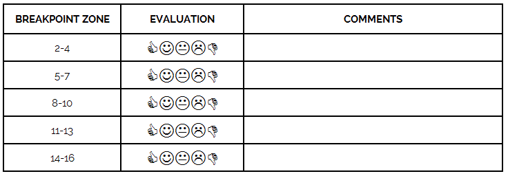 To determine important practice focus points, determine your level of comfort playing these breakpoint zones. Add specific comments to discuss frequency of practice time to play these zones or competition experiences.