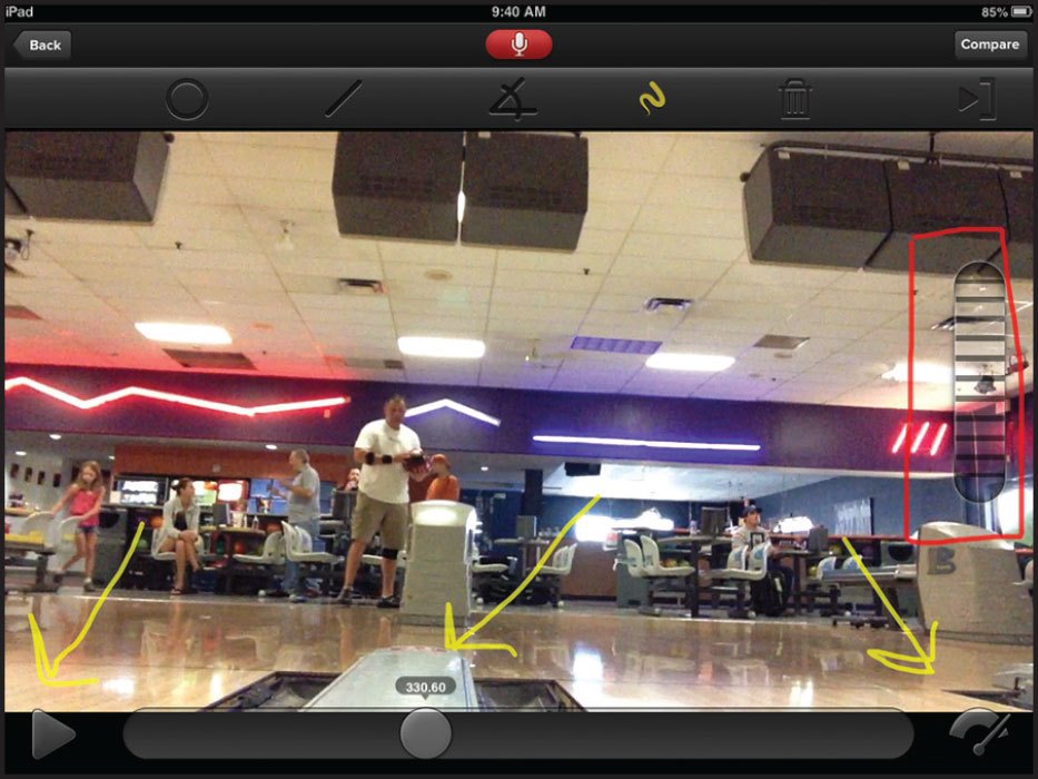 Using the annotation buttons at the top of the Coach’s Eye playback screen, circles, rectangles, lines, arrows, and free-hand shapes can be drawn.