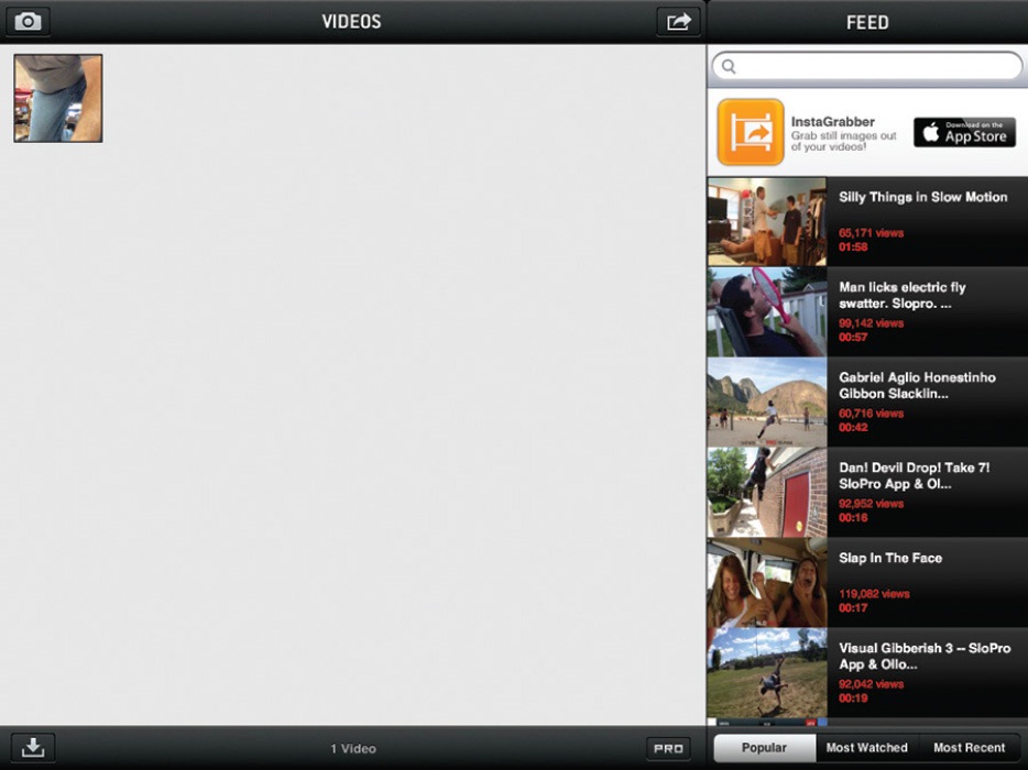 To get started, install the SloPro app from the app store as you would any other application. Tutorials and advanced help are available at www.sloproapp.com. SloPro focuses on providing clear slow motion playback using advanced techniques to get rid of blur. The initial SloPro screen lets you select or import a video for playback.