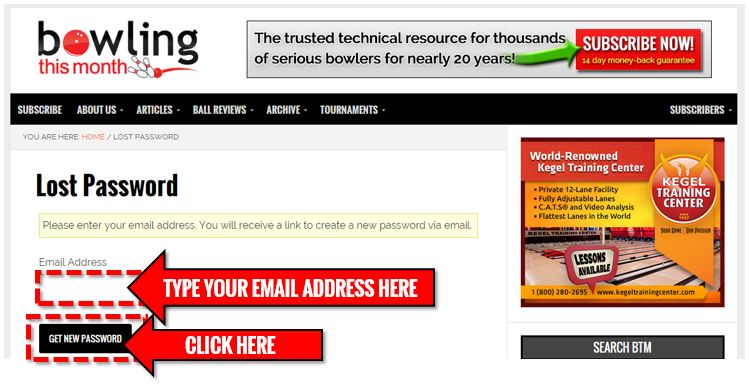 2) When you get to the Lost Password page, you will be asked for your email address. Enter the email address that you use to log-in to the BTM website. After you’ve entered your email address, click the “Get New Password” button.