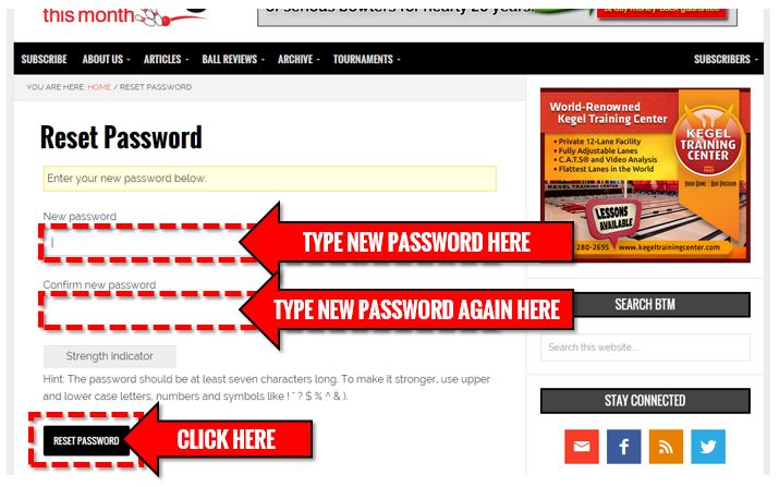 5) After clicking the above link, you should be taken back to the BTM website where you will have the opportunity to enter a new password. Enter your new password, confirm your password by typing it again in the second box, and then click the “Reset Password” button.